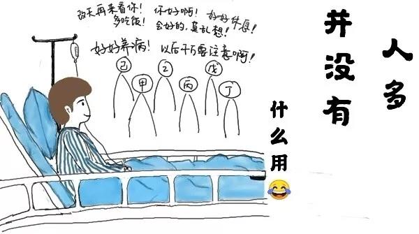 親戚或朋友住院,人們總想買些東西去看望,習慣吆喝招呼一群人呼呼啦啦地涌去病房,表一表我們的關心,或盡一盡人情世故。于是乎,衍生了這些個常見的場景: